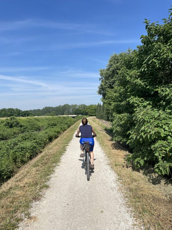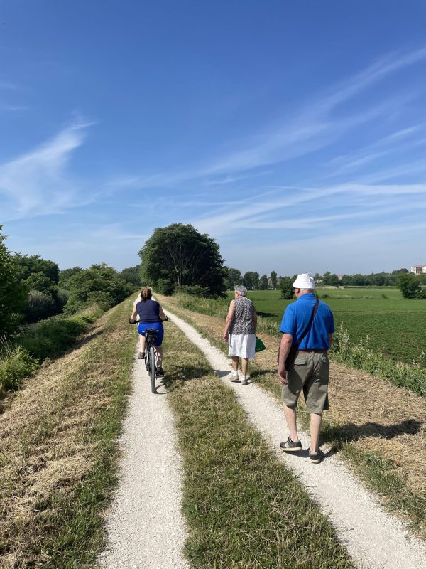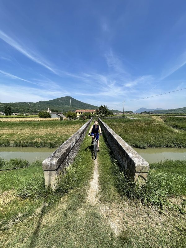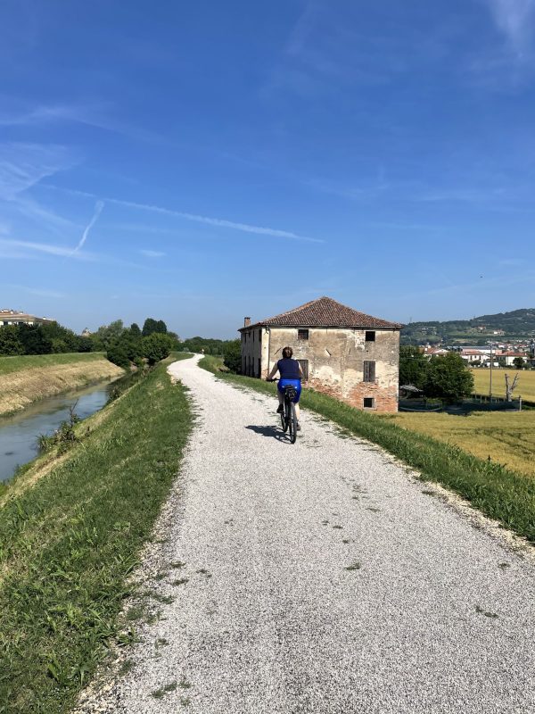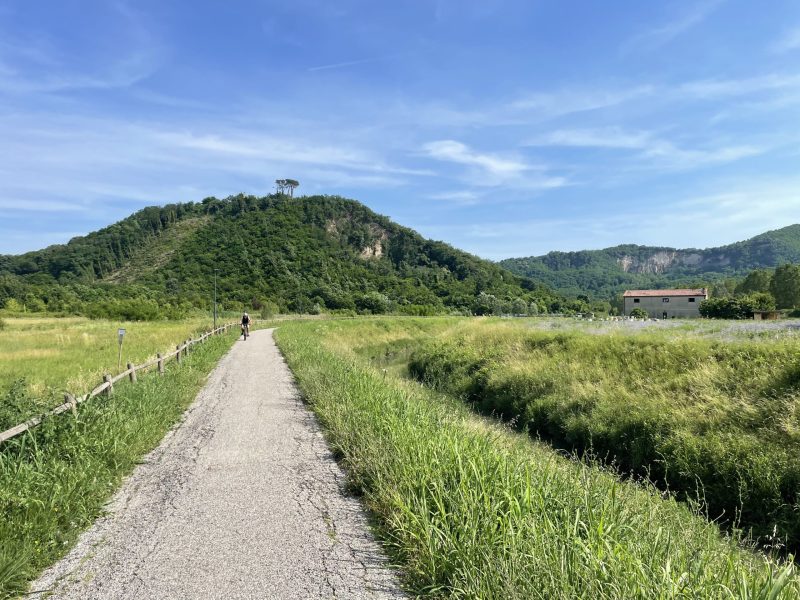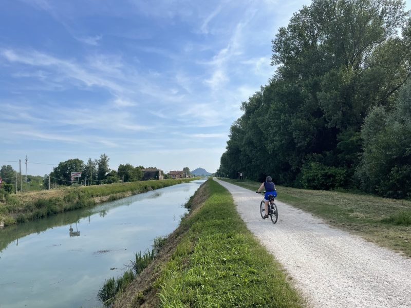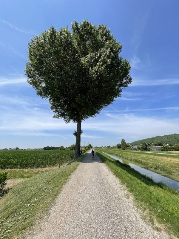 Partiamo da uno dei tanti accessi lungo l’Anello dei Colli Euganei e pedaliamo immersi nella campagna veneta, costeggiando i rilievi vulcanici dei Colli Euganei. Il tracciato è facile, pianeggiante e accessibile a tutti, con fondo misto asfaltato, sterrato compatto e strade secondarie a basso traffico, ideale per bici gravel o MTB, bici da cicloturismo.
